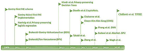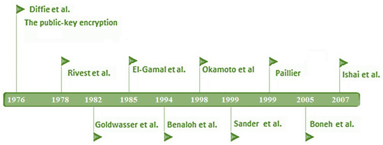 A cryptographic algorithm is defined as partially homomorphic if it can perform additive or multiplicative homomorphism but not both operations at the same time. Figure 3 shows the timeline of homomorphic encryption algorithms leading up to Gentry’s first fully homomorphic encryption. Partially homomorphic encryption algorithms are, in general, more efficient than fully and somewhat homomorphic encryption algorithms [16]. Herein, RSA, ElGamal algorithms [17,18] with multiplicative homomorphism, and Paillier additive homomorphism [19], respectively, are well-known examples of partial homomorphic algorithms. Many big data have been proposed in the last few years based on partial homomorphic algorithms such as in healthcare [20], intelligent transportation systems [21], and deep learning applications [2,22].