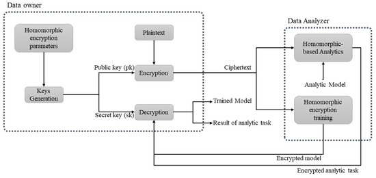 To enrich this research, we present a practical scenario in which homomorphic encryption is used for privacy-preserving machine learning algorithms for Big Data analytics. Figure 5 shows the details of this scenario. For example, imagine an untrusted data analyzer that has a trained model and perhaps computational capabilities to perform the analysis tasks for various users’ data. Originally, the private prediction was introduced as a service when the data owner outsourced the analysis or prediction of private encrypted data to a third party.