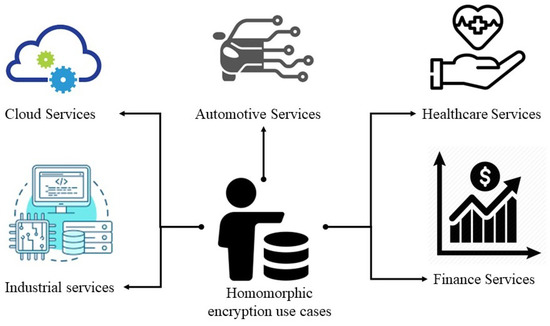 Multi-key homomorphic encryption can deal with the use cases of multiple parties [48,53], combining their separately encrypted data in one service, then processing the encrypted data, and finally, only the authorized parties that provided the data could see the outcome. The use cases can be developed further with the adoption of multi-key homomorphic encryption. Figure 6 shows some potential homomorphic encryption real-world use cases, especially with the adoption of a multi-key mechanism. We illustrate some examples of industrial viable use cases where homomorphic encryption can be deployed directly, such as customer financial and credit risk rating [54,55], supply chain [56], automotive systems [57], and healthcare applications [58,59].