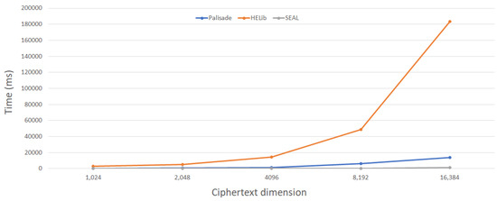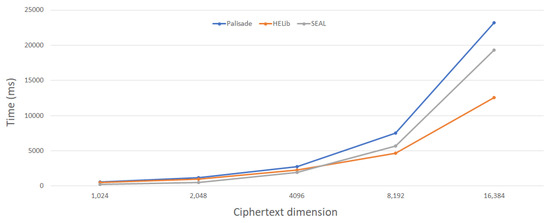 Figure 7 and Figure 8 show the results of the measured runtimes for encryption and decryption depend on the dimension of the ciphertext. As shown, the ratio of the performance differences decreases as the dimension of the ciphertext increases. The encryption process in the CKKS scheme performs best when the HELib library is used for ciphertext dimension n = 8192, but the SEAL library gives the best results for smaller dimensions n. The decryption process in the CKKS scheme performs best when the SEAL library is used. Using SEAL, the decryption procedure in the CKKS scheme is faster than using Palisade and HELib.