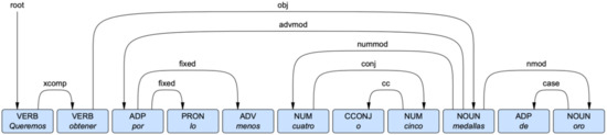 An example of the Universal Dependencies Treebanks dependency framework from Spanish. Syntactic dependencies are represented by arrows pointing from heads to their dependents, and each dependency is labeled for the type of relation. The translation of the sentence is ‘We want to get at least four or five gold medals’.
