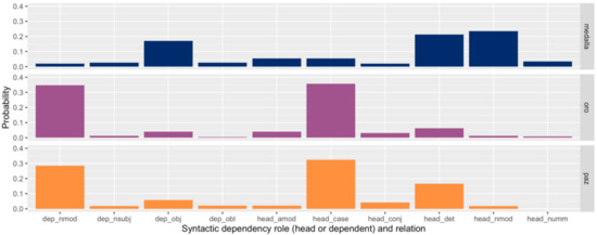 Partial probability vectors for the participation of three Spanish lemmas in different syntactic roles and relations. The height of each bar indicates how often that lemma participates in that dependency type relative to other syntactic dependency types. The probabilities shown are corrected for sample bias with the James–Stein shrinkage estimator. These three distributions illustrate how oro is much more similar syntactically to paz than to medalla, despite being more similar semantically to the latter.