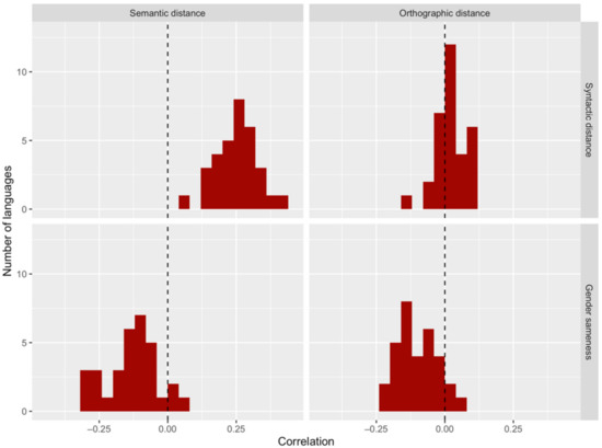 Correlations between our variables of interest (syntactic distance and gender sameness) and secondary variables (semantic distance and orthographic distance) among the 32 languages of our study. Semantic and syntactic distances are correlated positively in every language, while orthographic and syntactic distances are correlated positively in more than two-thirds of the languages. Both semantic and orthographic distances are correlated negatively with gender sameness in over 90% of the languages.