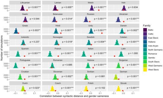 Controlled permutation analysis of the correlation between syntactic distance and gender sameness in lemma pairs of 32 languages. The red dots represent the true correlations observed in the data, while the histograms represent simulated correlations. Language families are represented by different colors. For 25 of 32 languages, the real correlation value is significantly greater than expected by chance (meaning of asterisk notation: p < 0.05 *; p < 0.01 **; p < 0.001 ***).