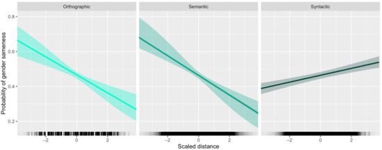 - An increase in orthographic distance predicts a decrease in probability of gender sameness;