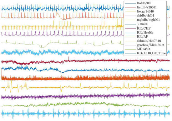 As each database consists of multiple records from different subjects, we select one record randomly from each database. Specifically, we choose record “00” from ltafdb, “s20011” from ltstdb, “14046” from ltdb, “chf01” from chfdb, “mgh001” from mghdb, “chb07_01” from chbmit, “Miss_30_2” from gearbox, “XE110_DE_Time” from RB, and “380_t” from MD. Moreover, noise signal, an artificial signal, is studied to increase diversity. The time series considered in this section are illustrated in Figure 1, where all samples are normalized to have a standard deviation of 1, since the parameter threshold r is proportional to the standard deviation of the records, and thus the whole range of the records is negligible.