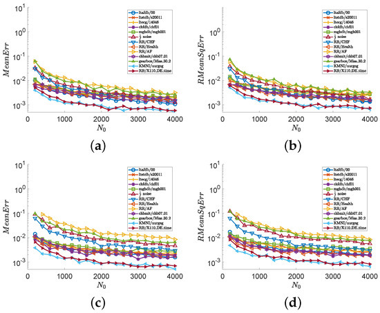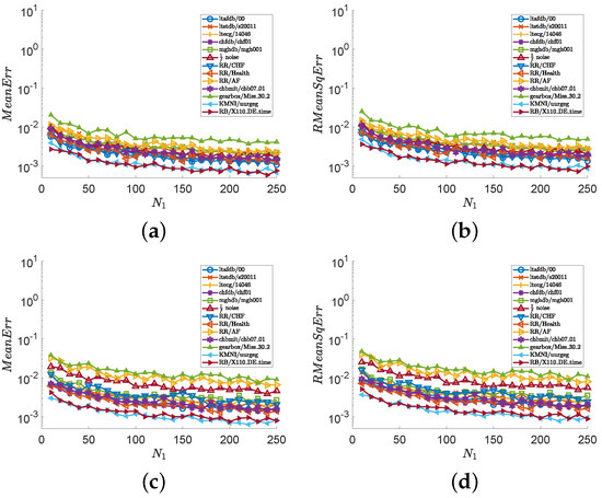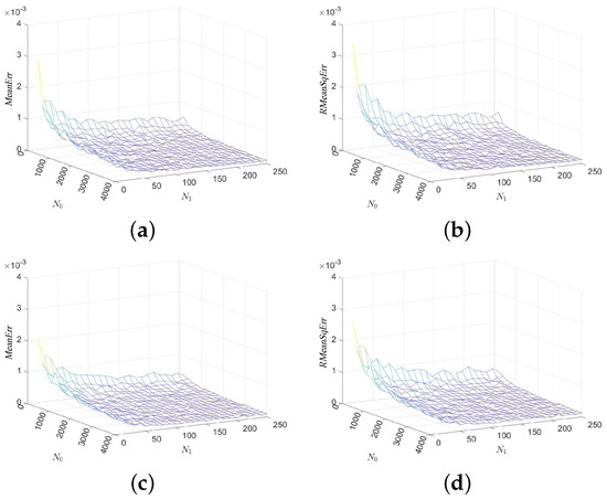 The values of and for time series “mghdb/mgh001” with respect to the sample size and the number of computations , where parameters and . (a) with . (b) with . (c) with . (d) with .