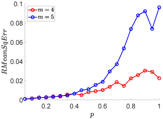 Here, we apply MCSampEn to , and show the results of versus p in Figure 5. From Figure 5, we can observe that the values of increase linearly with a very small growth rate when . When , the values of are significantly faster than that of . Therefore, we believe that when the randomness of a time series is weak, the error of the MCSampEn algorithm is small; as the randomness of the time series increases, the error of the MCSampEn grows.