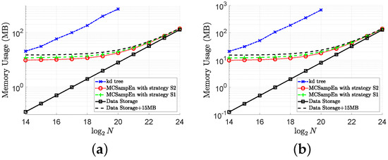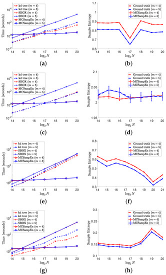 The results of the second strategy are shown in Figure 7, where and . The results for are marked by red color, and the results for are marked by blue color. The left column of Figure 6 shows the values of computation time consumed by the kd-tree, SBOX, and MCSampEn algorithms, which are presented by the dashed lines marked “x”, the dash-dot lines marked “+”, and the solid lines marked “o”, respectively. From the left column of Figure 7, we also can see that with the second strategy, the computational time of MCSampEn algorithm is much less than that of the kd-tree and SBOX algorithms, since the computational complexity of Algorithm 2 is . Furthermore, we observe that MCSampEn achieves a speedup of more than 100 compared to the SBOX algorithm when N goes from to , and it is over 1000 times faster when . Compared to the kd-tree algorithm, the MCSampEn algorithm can still obtain up to 1000 times acceleration when .