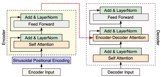 Transformer [] is a novel encoder–decoder model that is based on the attention mechanism and totally removes recurrent neural networks, which can compute the sequence effectively. The canonical transformer employs an encoder–decoder structure, consisting of stacked encoder and decoder layers. As shown in Figure 1, encoder layers are composed of two sublayers: self-attention, followed by a position-wise feed-forward layer. The encoder produces a vector to feed to the decoder. Decoder layers consist of three sublayers, which are followed by encoder–decoder attention, and a position-wise feed-forward layer. The decoder uses masking in its self-attention to prevent a given output position from incorporating information about future output positions during training. Transformer accelerates training speed and convergence by utilizing residual connections surrounding each of the sublayers, followed by layer normalization.