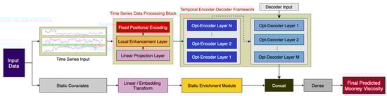 Mooney viscosity forecasting can be considered as a type of multivariate time series forecasting issue, in which different time series variables at the manufacturing site are used to predict the rubber’s Mooney viscosity. For genuine rubber refining [], the production process is divided into different stages, with each stage requiring a unique processing operation, as reflected in the temporal characteristics of dynamic time series components that are constantly changing at different stages. As a result, it is vital to capture and assess the time relationship between the various processing stages, particularly their relative order, which has a significant effect on the final predicted Mooney viscosity. Additionally, there are several static covariates in rubber refining that are scalar in nature and do not exhibit temporal dynamics, and some of them are completely irrelevant to the Mooney viscosity. Feeding them directly into the transformer model for nonlinear processing does not always result in optimal calculation results, but rather raises the computational cost. The Mooney viscosity prediction problem is merely a microcosm of the current challenges associated with solving complex time series prediction problems in real-world industrial scenarios. Therefore, it is critical to investigate a temporal fusion model that can handle time series input and static covariates differently, which can fully capture the time series input’s temporal dynamics and perform flexible nonlinear processing for static covariates, so as to achieve accurate prediction.
