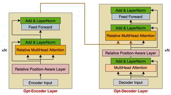 - The output of and the opt-encoder layer output are used as the input of the relative multi-head attention, and the addition and layer normalization operations are performed.