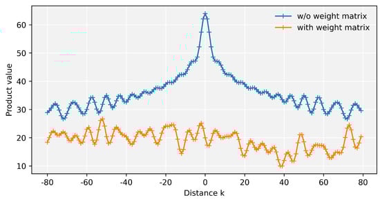 It can be seen that the final result is only related to the relative position of the two positions, that is, Equation (9) contains relative position information. However, when the matrix is included in Equation (9), as in term (d), the relative position information cannot be reflected clearly. To prove this claim, the two formulas  and  are visualized in Figure 6.  is set to be 128, and W in  is the trained matrix in transformer. As illustrated in Figure 6, the above curve corresponds to , with obvious trends and patterns, which means that it can reflect relative position information. In contrast, the lower curve has no clear pattern. Therefore, it can be concluded that the self-attention calculation will lead to the loss of relative position information.