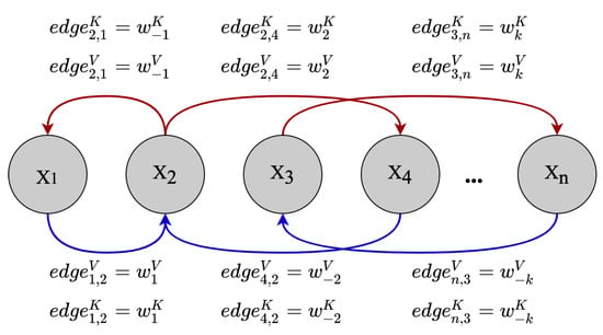 Motivated by the above findings, relative position information needs to be specifically added to the self-attention computation. As illustrated in Figure 7, to represent the relative position of elements in the time series data, we model the time series data as a directed, fully connected graph []. Suppose there are two elements in the time series denoted as  and , which are connected by two opposite-direction edges  and , which are used to represent the relative position information between the two elements. In addition, we assume that once the distance between two elements in the time series reaches a certain value, their relative position information is insufficient to have a substantial effect on the prediction results. As a result, the greatest effective distance between elements is limited to k, and  unique edges label are considered: