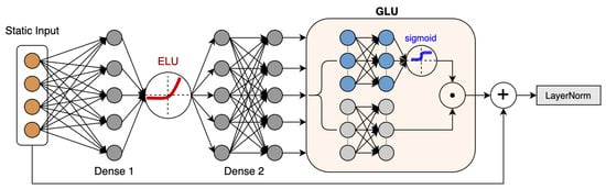 - We proposed a static enrichment module, which is used to integrate information from static covariates. The gated linear unit (GLU) [] is added in this module to filter out unnecessary information and to control the extent of nonlinear processing of static covariates, hence boosting the model’s flexibility to capture static features.