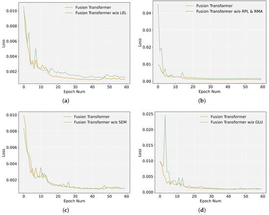 Comparison of loss function curves before and after deleting various modules. (a) Ablation analysis of LEL; (b) Ablation analysis of RPL and RMA; (c) Ablation analysis of SEM; (d) Ablation analysis of GLU.
