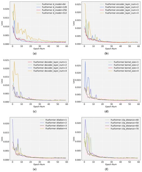 Loss function curves of different values of hyperparameters. (a) Loss curves for different values of model dimension; (b) Loss curves for different values of encoder layer num; (c) Loss curves for different values of decoder layer num; (d) Loss curves for different values of kernel size; (e) Loss curves for different values of dilation; (f) Loss curves for different values of clip distance.