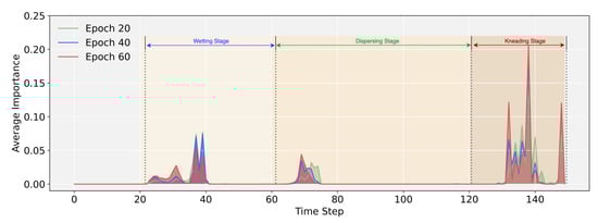 As shown in Figure 13, the curve is divided into four parts. The first part has no effect on the forecast since we filled the beginning of the time series with a value of 0 to provide a constant input length for the time series, and so this section lacks temporal patterns. The remaining three parts correlate to the three stages in the rubber refining process. It can be clearly seen that these three stages have different degrees of influence on the Mooney viscosity, with the kneading stage having the greatest influence. Meanwhile, as the number of epochs increases, FusFormer’s analysis of time steps importance is more accurate. When FusFormer completes training, combined with prior knowledge of tire manufacturing, the significance of these three components highly matches the features of the actual rubber refining process, demonstrating the effectiveness of the interpretable relative multi-head attention.