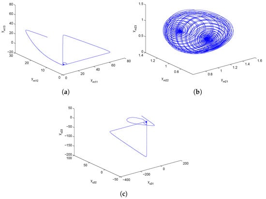 where is the state vector of the system, and , and are positive parameters. Moreover, in Equation (11), represents the prey population, and , denote the predator populations. For parameter values , , and initial conditions , the slave GLV system displayed chaotic behavior, as exhibited in Figure 1c. Additionally, the detailed study and numerical results for Equations (9)–(11) are found in [19]. Further, , and are controllers that are determined so that CDPS among identical GLV chaotic systems could be attained.