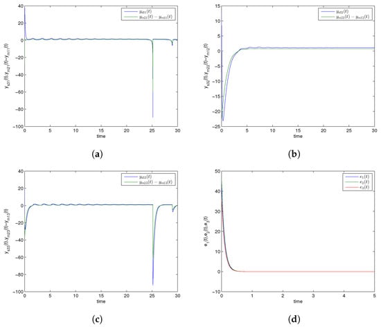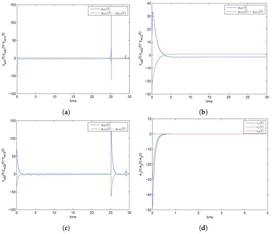 Numerical simulations are specifically presented through MATLAB software to show the effectiveness of the CDPS scheme via ACM. We take here and for all , which shows that the considered slave model would be projectively antiphase synchronized with the combination of the given master systems. Further, were chosen to be 6. The initial conditions of Systems (9) and (10) and corresponding Slave System (11) were , , and , respectively. The trajectories of Master Systems (9) and (10), and Slave System (11) achieving projective antiphase synchronization are shown in Figure 2a–c. In addition, synchronization error functions converging to zero for t tended to infinity, as shown in Figure 2d. Consequently, the discussed CDPS approach in master and slave systems is numerically demonstrated. Figure 3a–d exhibit the trajectories for Master Systems (9) and (10), and Slave System (11), attaining projective complete synchronization by choosing , for all and .