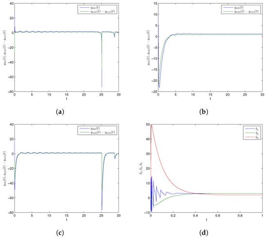 Clearly, Lyapunov function , as defined in Equation (21), is surely positive definite in . Then, the derivative for Lyapunov function is expressed as: