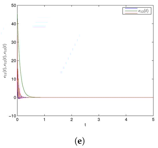 Further, numerical simulations were implemented through MATLAB software to show the effectiveness of the CDPS scheme via PIM. We take here and for all , displaying that the considered slave chaotic system would be projectively completely synchronized with the combination of the given master systems. Further, were chosen to be 6. Initial conditions for Master Systems (9) and (10), and corresponding Slave System (11) were , , and , respectively. Trajectories for Master Systems (9) and (10), and Slave System (11) achieving projective complete synchronization are shown in Figure 4a–c. Furthermore, Figure 4d depicts that the estimated values of unknown parameters asymptotically converged to their originally described expressions with time. In addition, synchronization error functions converging to zero for t tended to infinity, as shown in Figure 4e. As above, Figure 5a–e exhibit trajectories for Master Systems (9) and (10), and Slave System (11), attaining projective complete synchronization by choosing , for all and . Thus, the discussed CDPS scheme for master and slave systems was computationally confirmed.
