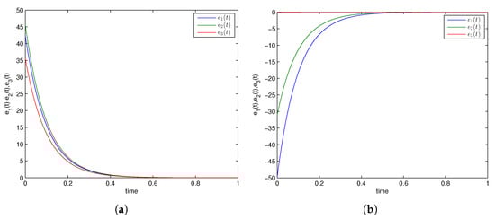 Time series of error convergence by active control method. (a) Combination difference projective complete synchronization; (b) combination difference projective antiphase synchronization.