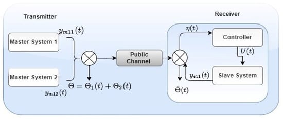 Chaos synchronization has a huge spectrum of applications in secure communication [60,61,62,63,64,65,66,67]. Numerous types of secure communication strategies were illustrated, such as chaos modulation, chaos masking, and chaos shift keying. In chaos communication schemes, the essential idea of transmitting a message utilizing chaotic or hyperchaotic models is that a message signal is embedded in a transmitter system that generates a chaotic signal. After that, this chaotic signal is emitted to a receiver through a public channel. The message signal is lastly recovered by the receiver. A chaotic system is primarily used as both transmitter and receiver. Subsequently, this theory needs significant consideration in various research fields.