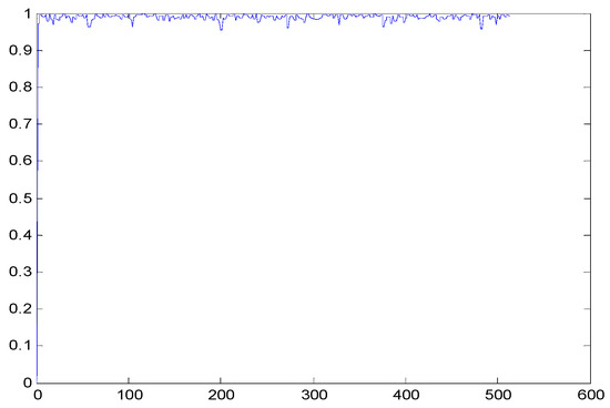 The study of the effect of noise on the encrypted and marked image in addition to the effect of noise on the recovered mark is shown in Table 2. It is clear that by increasing the additive white Gaussian noise (AWGN), the SNR between the noisy image and original image takes values from 5 dB to 50 dB, the correlation between the original and recovered rows and column with original, i.e., the correlation between extracted blocks and original blocks increased from 0.1 to 0.75, which verifies that the recovered mark does not match the original mark. The correlation values which are used to express the similarity between blocks in a marked image and blocks in a non-marked image are calculated in Table 3. A higher correlation means that the image is marked, this is explained as the blocks which have a mark within row or columns get a high value of correlation, which is near 1, but the others with no mark get low values of correlation. Correlation values in Figure 4 ensure the possibility of mark verification, which means that we can verify the presence of a mark when the correlation between the recovered rows and columns and the original is equal to 1, as it illustrates the correlation between blocks of a marked image which equals to 1. As a result, this confirms that the image is marked. In Table 3, we did not apply marking to the image, and we divided the image by the same technique and compared the blocks with each other. We find that the correlation is close to zero and this means that the image is not marked by this method. As a result, we verify the originality of the image which contains the mark.