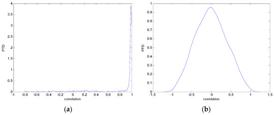 The test data for picture authentication systems include both marked and unmarked images. The Probability of True Distribution (PTD) and Probability of False Distribution (PFD) are used to assess the correlation scores obtained during the authentication stage. As illustrated in Figure 5a, the Probability of True Distribution (PTD) is the probability distribution of the correlation between the designated image blocks, the marked blocks. The Probability of False Distribution (PFD) is the probability distribution of the correlation between the blocks of the unmarked image as shown in Figure 5b.