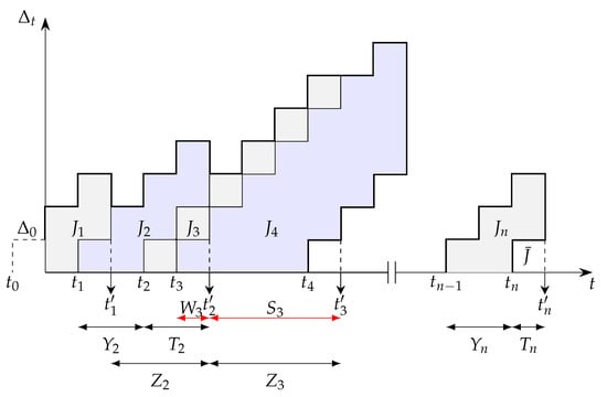 where is the number of samples during the observation interval. Using Figure 2, Equation (9) can be calculated as the area under . Starting from , the area is decomposed into the areas , and the area of width over the time interval that is denoted by . Therefore, one can write the average AoI of the first user as a sum of disjoint geometric parts as