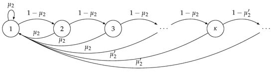 According to (22), the AoI drops to one when there is a successful reception of a status update at the receiver. Otherwise, it increases by one. We can model the evolution of the AoI of the second user as a Discrete-Time Markov Chain (DTMC). The DTMC is shown in Figure 3, in which when ( is the threshold of the AoI of the second user), a packet is transmitted with the probability . Also, a packet is transmitted with the probability when . The service probability of the first user can be written as