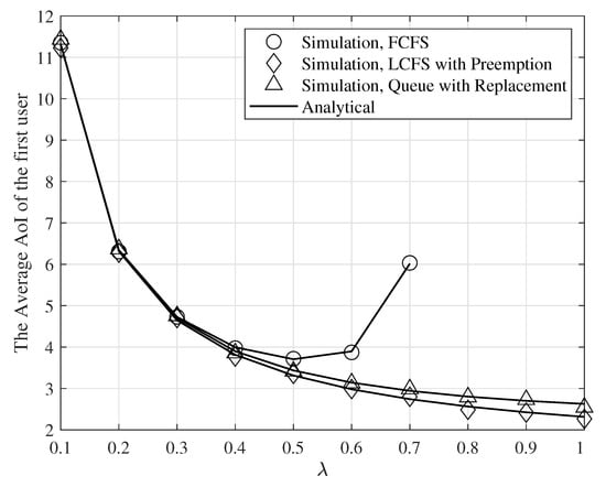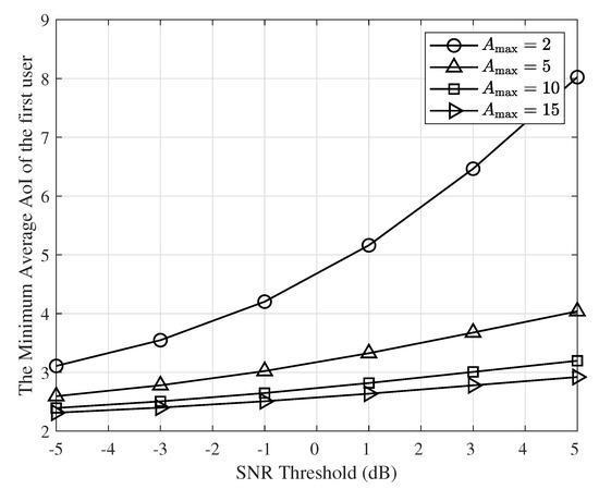 According to Equation (36), has its maximum value when is maximum. Therefore, by selecting , we can maximize the service probability of the first user and minimize the average AoI of the first user as an objective function. Therefore, the optimal value of is given by