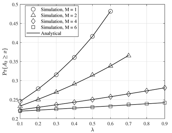 Figure 6 shows the probability that the AoI of the second user to be greater than a threshold as a function of for , , , , , and selected values of M. As seen in this figure, when increases the probability increases. This is because when increases the service probability of the second user decreases and therefore it increases the AoI of the second user. Furthermore, by increasing M, the success transmission probabilities increase, and the service probability of the second user increases. As a result, the AoI of the second user decreases and the probability has lower values. Note, importantly, that when , the probability does not have a value for . This is because for , becomes larger than and thus the AoI of the second user does not have a value.