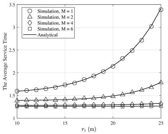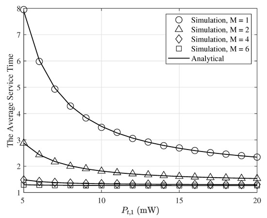 Figure 7 shows the average service time of the first user, , as a function of () for , , (i = 1, 2), , , , and selected values of M. As seen in this figure, when transmitted power increases, the average service time decreases. This is because by increasing the transmitted power, the success transmission probabilities increases and thus the average service time decreases. Furthermore, when M increases, the average service time decreases. This is because when M increases, the service probability increases such that it decreases the average service time.