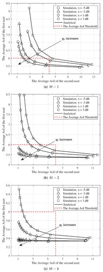 Figure 10 shows the interplay between the average AoI of the first user for a discrete-time Geo/Geo/1 queue discipline of FCFS and the average AoI of the second user when as a function of and selected values of . In this figure, we consider the weak/strong MPR capabilities. We denote that the strong and weak MPR capability of a receiver corresponds to and , respectively []. When for and , and , respectively. Therefore, the receiver has strong MPR capabilities. Furthermore, for and , and , respectively; thus, the receiver has weak MPR capabilities. Additionally, when for , , respectively. Moreover, when for , , respectively. Therefore, when the receiver has strong MPR capabilities for selected values of . In Figure 10, we consider a different scenario from the optimization problem scenario in (34). Here we intend to find transmission probabilities and that both users transmit at the same time to keep the average AoI of the first and second users below a threshold and respectively. Observe that when the receiver has strong MPR capabilities, we have and with a high value of transmit probability . Therefore, in this case, both users can transmit at the same time with a high probability. For example, we assume the thresholds for the average AoI of the first and second users are equal to and , respectively. As seen in this figure when M equals 1, and (strong MPR capability), we can achieve our purpose with and while for (weak MPR capability), we cannot find a value of to achieve our goal. In this case, both users cannot transmit at the same time. Additionally, observe that in Figure 10b, when the first and second users can transmit at the same time with the probabilities of and . Furthermore, when , the transmit probability of and are equal to and . In addition, as shown in Figure 10c, when and , both users can transmit at the same time with the probabilities of and . This reflects the fact that when the number of receiver antenna increases, the receiver has a strong MPR capability for higher values of and thus both users can transmit at the same time with a high probability.