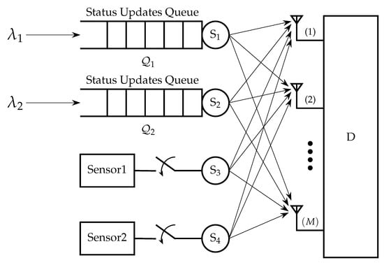 Age of Information (AoI) is considered to be a metric for characterizing the timeliness and freshness of data [,,,]. AoI was first introduced in [], and it is defined as the time difference between the current time and the time that the latest status update was successfully received by a destination. In [,,,,,], the authors derived the average AoI for systems with different availability of resources using different queuing models. The M/M/1, M/D/1, and D/M/1 queues were studied under the first-come-first served (FCFS) queue management protocols in []. In [,,,,], the authors considered the last-come-first-served (LCFS) queue protocols with or without the ability to preempt the packet in service. Recently, different types of traffic associated with different source nodes have been considered in which some nodes generate time-sensitive status updates and other nodes strive to achieve high throughput. The performance of a multiple access channel with heterogeneous traffic has been investigated in [] where one user has bursty arrivals of regular data packets while another AoI-oriented sensor has energy-harvesting capabilities.