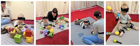 Interactions were recorded in a laboratory room on a carpeted play area. Upon the family’s arrival, an experimenter explained the study protocol and obtained parental consent. Once the infant was familiarized with the laboratory, the wearable motion trackers attached to the elastic bands were put on the infant’s and caregiver’s bodies. Then, a set of parent–child interaction tasks with different sets of age-appropriate toys took place. The sets for infants aged 4 and 6 months were slightly different from those for infants aged 9 and 12 months to maintain their interest in a given task (see Figure 2). There were 6–7 different tasks during each meeting, but here, we report data comparing two of them—free play and rattle-shaking. In a rattle-shaking task, which lasted approx. 5 min, the dyads were given two maracas rattles and two rattles of different types (the barbell rattles for younger infants and teddybear rattles for older ones). In a free play task, which lasted approx. 10 min, the younger infants were offered a large, standard set of toys that included baby books, teethers, rattles, rubber blocks and plush toys. The set for older infants included block sorter, cars, stackable cups, rubber blocks, puppets, rattles, plush toys and a wooden box with a drawer and a ball. Caregivers were instructed to play with their infants using each set of toys in their preferred way, as they usually do at home.