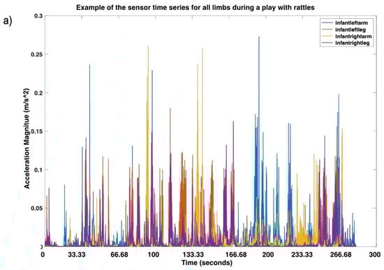 Infants’ and caregivers’ movements were recorded at 60 Hz using wearable motion trackers (MTw Awinda, Xsens Technologies B.V., Enschede, The Netherlands): an Awinda station receiver (Xsens Technologies B.V.) and MT Manager Software (Xsens Technologies B.V.). Overall, 12 sensors were used (on infant’s arms, legs, head and torso, see Figure 1, and on caregiver’s arms, head and torso), but in this paper, we report data only from 4 sensors placed on infant’s arms and legs.