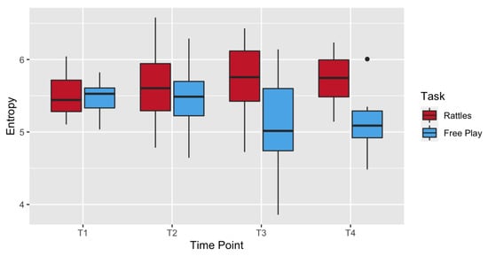 The GEE with age (4) and task (2) as within-subjects factors showed a significant difference in entropy level between rattle-shaking and free play (Wald (1) = 36.888, p < 0.001; see Figure 4). There was no effect of time point (Wald (3) = 3.365, p = 0.339), but the interaction between task and time point was significant (Wald (3) = 26.634, p < 0.001). Post hoc pairwise comparisons revealed that there were no task-related differences at T1 and T2. The entropy was higher in rattle-shaking than free play at T3 (p < 0.001) and T4 (p = 0.010). Within free play, entropy was also higher at T2 than at T3 (p = 0.037). See Table 2 for descriptive data.