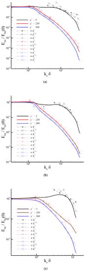 One-dimensional energy spectra in the spanwise direction at 5, 250, and 500 for: (a) Incompressible DNS, (b) Mach 2.5 DNS, and (c) Mach 2.5 iLES.