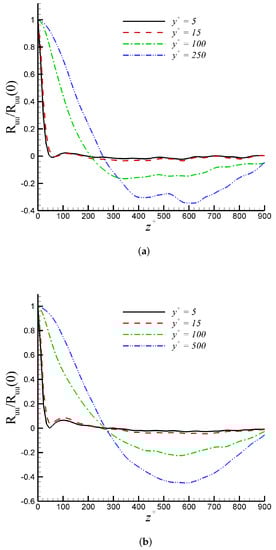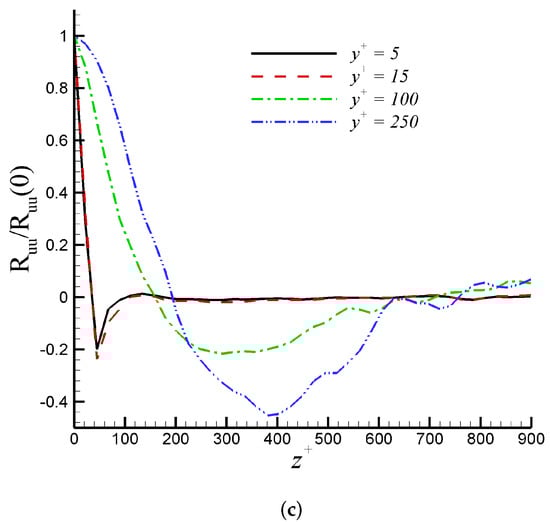 Davidson [51] suggested in his paper that two-point correlations were the best statistical parameter for assessing LES resolution. The two-point correlations () of are shown at 5, 15, 100, and 250 in Figure 4 for DNS and iLES. In all cases, it is observed that the autocorrelation coefficients, , decay toward zero over a distance of at most in the outer region. This confirms that the computational domain is sufficiently wide along the spanwise direction. Additionally, the profiles of in Figure 4 depict a local minimum. For 5 and 15, these minimum values are at 50, which indicates an average spacing () of low-speed streaks equal to 100. This value is in agreement with the universally accepted range of according to [52]. An evident streak spacing increase can be seen in the log region. The trend of two-point correlations confirms the suitability of the selected domain width in all cases. This is consistent with the resolution sensitivity study by [33], stating that the computational domain should be at least two times the maximum boundary layer thickness in iLES predictions. In our case, the iLES computational domain is 2.7.