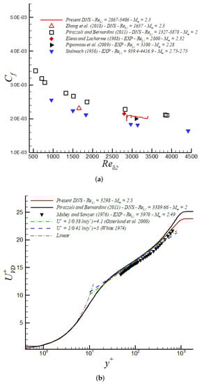 (a) Skin friction coefficient and (b) van Driest transformation in wall units at = 2.5 via DNS.