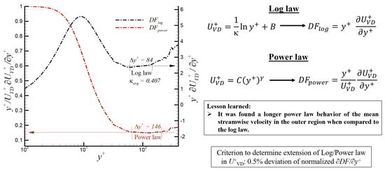 The infographic in Figure 6 depicts the performed analysis to evaluate the presence of either logarithmic or power law inside the supersonic SDTBL based on highly accurate DNS data. In Figure 6, the corresponding diagnostic functions for the log and power laws are highlighted. Constant values of these functions indicate the local presence of either a log or power law behavior. Moreover, an average value of 0.407 was obtained for the or von Karman constant. On the other hand, the computed average value of in the power law was approximately 0.15. Interestingly, the power law region occupies a more extended portion of the boundary layer with respect to the log law, i.e., 146 (power) vs. 84 (log) in wall units.