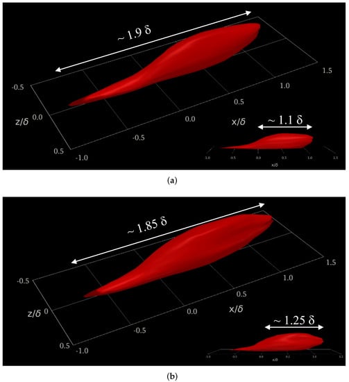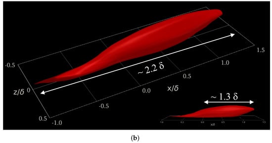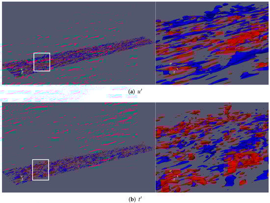 Iso-surfaces of resolved streamwise velocity fluctuations () and thermal fluctuations () were extracted and are displayed in Figure 14. Positive values of fluctuations are in red, whereas negative values are represented by blue surfaces. Iso-surfaces of were extracted at 20% of the freestream velocity (±0.20), while the wall temperature (maximum) was considered as a reference for thermal fluctuation extraction, i.e., . From Figure 14a, one can observe the presence of low (blue) and high (red) speed streaks, particularly in the near-wall region. A close-up window can be seen on the right. Low-speed streaks appear as very elongated parcels of fluid with low momentum. At such a moderate Reynolds number, the turbulence structure is finer and more isotropic with respect to lower Reynolds numbers (not shown here). Some strong ejection events (, ) can be observed (or pumping up of low-momentum fluid by hairpin legs). On the other hand, sweep events (, ) bring high-momentum fluid to the wall. Figure 14b exhibits iso-surfaces of static thermal fluctuations . Overall, the thermal fluctuating field seems to be more isotropic, with a much finer structure of turbulence. The Reynolds analogy is somewhat satisfied but in the negative sense, i.e., 0, as reported by a number of investigators [35,49]. There are some regions of low-momentum fluid (or low-speed streaks), which are highly correlated to high (hot) thermal fluctuations and vice versa. Our experience dictates that the Reynolds analogy is much better satisfied in incompressible flow, indicating some compressibility effects at the supersonic regime.