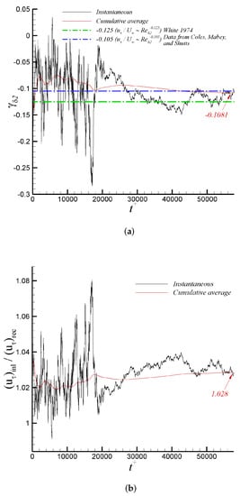 It is possible that the principal innovation of the present article is the implementation and evaluation of the turbulent inflow methodology based on DMA. Figure 9a shows the time variation of the power , as defined by Equation (9), for the iLES case. The power oscillates significantly in the transient stage of the simulation. The case was run for approximately 64 flow-through time to ensure convergence of flow statistics, where the temporal filter for “on the fly” calculation of the mean flow was varied. As the flow reaches the “statistically steady state” (sample collection was performed during the last 30,000 viscous time, i.e., , or last 35 flow-through time), the cumulative average value of the exponent is roughly −0.1081. This averaged power differs by around 13% from the typical empirical value of as described by White [66]. On the other hand, the time-averaged agrees quite well with regression (−0.105), as reported by [15], which is based on experiments by Coles, Mabey, and Shutts [68,69,70] at a Mach number range of . The time-averaged ratio is slightly above one by the end of the predictions, as seen in Figure 9b. In Figure 10a, the temporal evolution of the near-wall region is explored via the friction velocity (proportional to the wall shear stress) at the inlet, test, and recycle stations. It can be observed that friction velocities are within 5.17% to 5.5% of the freestream velocity, . The time variation of the edge of the boundary layer thickness in wall units is described by Figure 10b. Clearly, the proposed turbulent inflow generation [36,37,38] is demonstrated to be stable, being able to produce realistic inlet conditions. Similarly, the streamwise variation of the 99% boundary layer thickness, , and normalized by the inlet value is depicted in Figure 11a, where a very short developing section (∼2.5 to 3 ’s) is observed. Downstream, the typical linear behavior of the boundary layer thickness in ZPG flows can be seen. By the end of the computational domain, some wiggles are present, caused by the prescribed zero-flux condition at the outflow. Furthermore, the momentum thickness Reynolds number, , in Figure 11b exhibits a very analogous streamwise trend to .