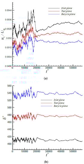 Time variation of (a) friction velocity normalized by freestream velocity and (b) boundary layer thickness in wall units at the inlet, test, and recycle plane via iLES.