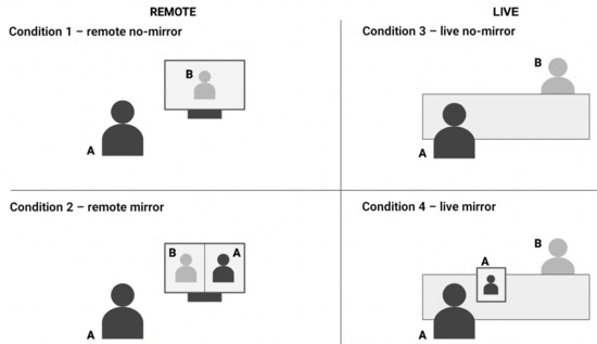 General schema of experimental conditions. In Condition (1), “remote no-mirror”, the participant sees their partner on the screen; in Condition (2), “remote mirror”, the participant sees their partner and their own mirror image side by side. In Condition (3), the “live no-mirror” participant sits in front of their partner with a dimmed smartphone screen placed in between, and in Condition (4), the “live mirror” participant sits in front of their partner with a smartphone displaying mirror image placed in between.