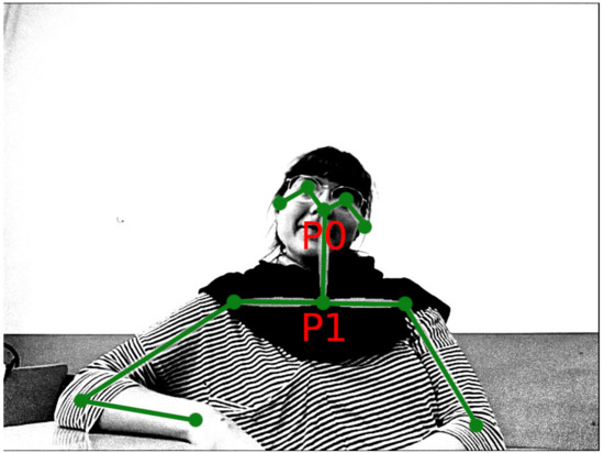 Output from OpenPose program: a video frame with detected key points marked. The two key points used in our analysis are P0 (tip of the nose) and P1 (point in the middle of the torso on the shoulder level).
