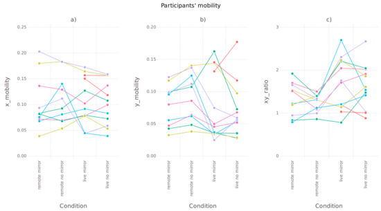 Horizontal mobility was similar in all conditions, vertical mobility was larger in remote conditions (), and the ratio was significantly larger in face-to-face conditions (). Additionally, studying the plot (Figure 3b) suggested that vertical mobility might be slightly larger in the “remote no-mirror” condition in comparison to the “remote mirror” condition. To verify this, we applied an additional paired samples Student’s t-test which compared the two conditions. We obtained () and , which gives support to the hypothesis that the conditions differ.